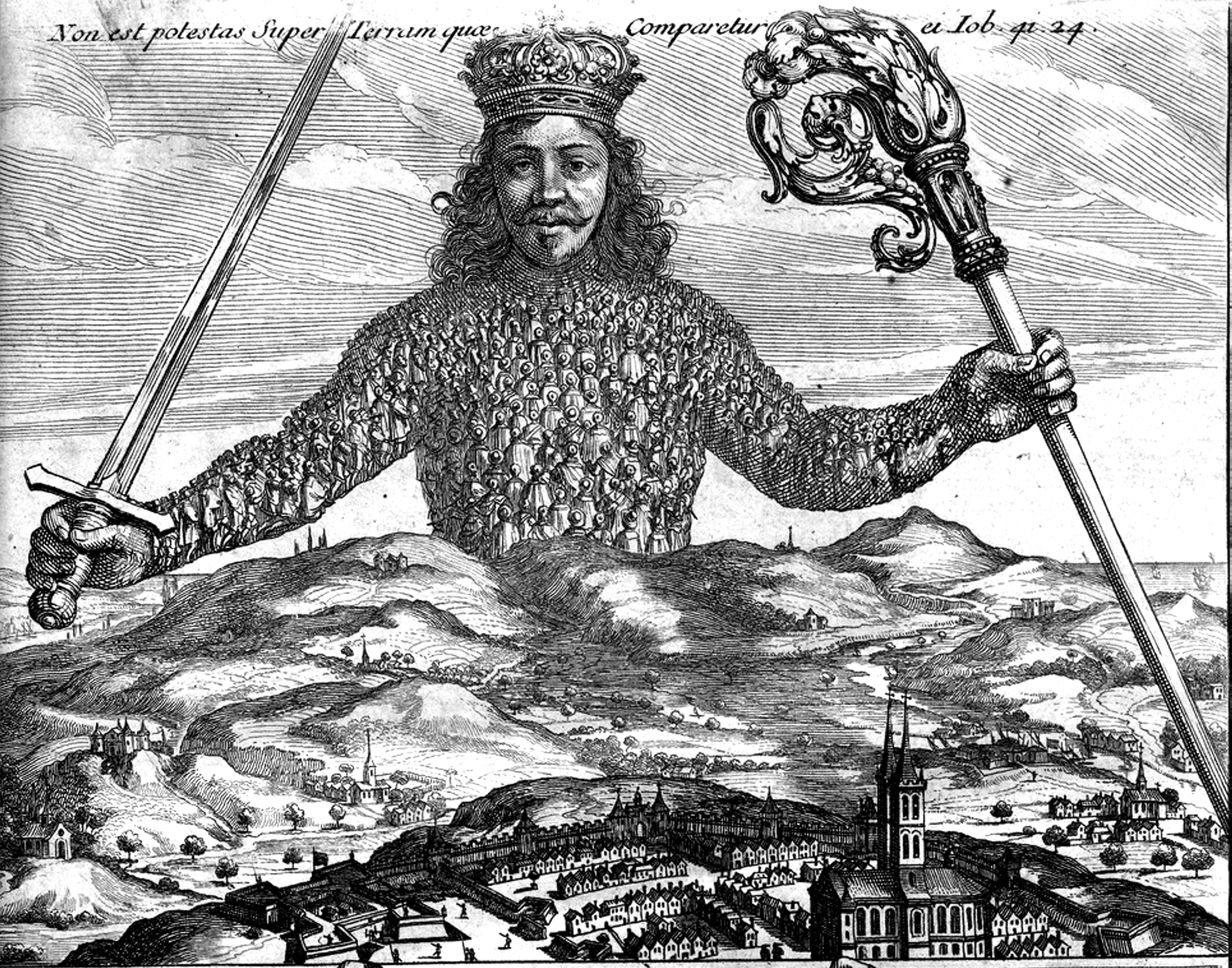 두 번째 그림은 토머스 홉스가 1651년 출간한 책 <리바이어던>의 표지그림이다. 인민대중 한 사람 한 사람이 모여서 통치자의 몸체를 형성하고 있으며, 통치자는 인민대중으로부터 절대권력을 위임받아 국가를 통치하는 모습을 그리고 있다. 하느님의 개입 없이 자연상태의 인민대중이 자유의지에 따라 계약을 맺음으로써 정치사회를 설립하고 통치자를 선출한다는 ‘사회계약론’의 핵심내용을 이보다 더 선명하게 보여줄 수 있는 그림도 드물 것이다.