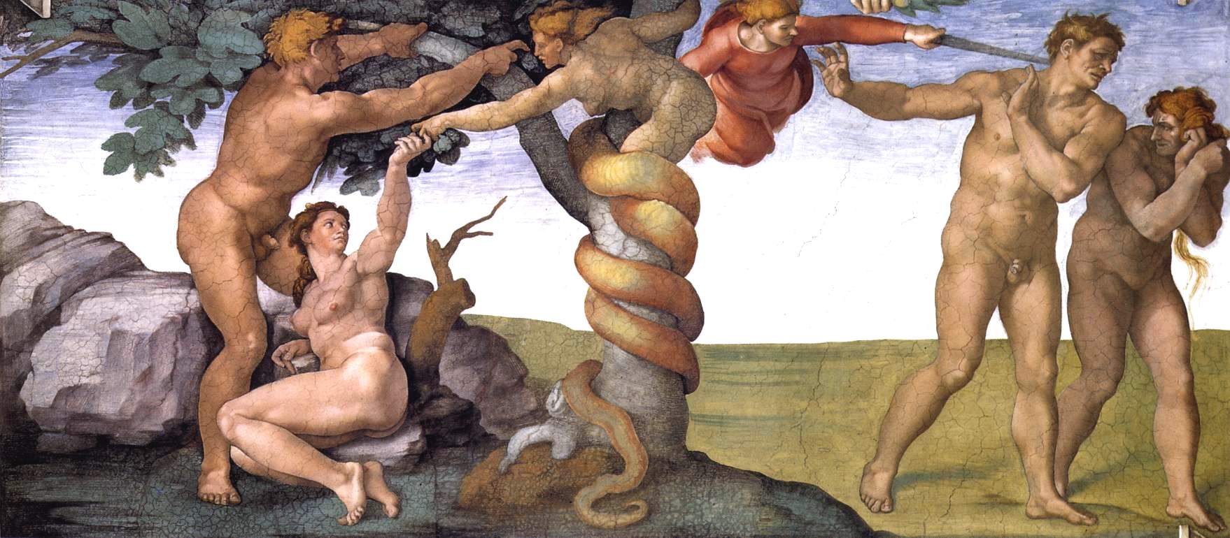 야훼 하느님께서 만드신 들짐승 가운데 제일 간교한 것이 뱀이었다. 그 뱀이 여자에게 물었다. “하느님이 너희더러 이 동산에 있는 나무 열매는 하나도 따 먹지 말라고 하셨다는데 그것이 정말이냐?” 여자가 뱀에게 대답하였다. “아니다. 하느님께서는 이 동산에 있는 나무열매는 무엇이든지 마음대로 따 먹되, 죽지 않으려거든 이 동산 한가운데 있는 나무 열매만은 따 먹지도 말고 만지지도 말라고 하셨다.” 그러자 뱀이 여자를 꾀었다. “절대로 죽지 않는다. 그 나무 열매를 따 먹기만 하면 너희의 눈이 밝아져서 하느님처럼 선과 악을 알게 될 줄을 하느님이 아시고 그렇게 말하신 것이다.” 여자가 그 나무를 쳐다보니 과연 먹음직하고 보기에 탐스러울 뿐더러 사람을 영리하게 해 줄 것 같아서, 그 열매를 따 먹고 같이 사는 남편에게도 따 주었다. 남편도 받아먹었다. 그러자 두 사람은 눈이 밝아져 자기들이 알몸인 것을 알고 무화과나무 잎을 엮어 앞을 가리웠다. 날이 저물어 선들바람이 불 때 야훼 하느님께서 동산을 거니시는 소리를 듣고 아담과 그의 아내는 야훼 하느님 눈에 뜨이지 않게 동산 나무 사이에 숨었다. 야훼 하느님께서 아담을 부르셨다. “너 어디 있느냐?” 아담이 대답하였다. “당신께서 동산을 거니시는 소리를 듣고 알몸을 드러내기가 두려워 숨었습니다.” “네가 알몸이라고 누가 일러 주더냐? 내가 따 먹지 말라고 일러 둔 나무 열매를 네가 따 먹었구나!” 하느님께서 이렇게 말씀하시자 아담은 핑계를 대었다. “당신께서 저에게 짝지어 주신 여자가 그 나무에서 열매를 따 주기에 먹었을 따름입니다.” 야훼 하느님께서 여자에게 물으셨다. “어쩌다가 이런 일을 했느냐?” 여자도 핑계를 대었다. “뱀에게 속아서 따 먹었습니다.” 야훼 하느님께서 … 여자에게는 이렇게 말씀하셨다. “너는 아기를 낳을 때 몹시 고생하리라. 고생하지 않고는 아기를 낳지 못하리라. 남편을 마음대로 주무르고 싶겠지만, 도리어 남편의 손아귀에 들리라.” 그리고 아담에게는 이렇게 말씀하셨다. “너는 아내의 말에 넘어가 따 먹지 말라고 내가 일찍이 일러 둔 나무 열매를 따 먹었으니, 땅 또한 너 때문에 저주를 받으리라. 너는 죽도록 고생해야 먹고 살리라. 들에서 나는 곡식을 먹어야 할 터인데, 땅은 가시덤불과 엉겅퀴를 내리라. 너는 흙에서 난 몸이니 흙으로 돌아가기까지 이마에 땀을 흘려야 낟알을 얻어먹으리라. 너는 먼지이니 먼지로 돌아가리라.” 아담은 아내를 인류의 어머니라 해서 하와라고 이름지어 불렀다. 야훼 하느님께서는 가죽옷을 만들어 아담과 그의 아내에게 입혀 주셨다. 야훼 하느님께서는 “이제 사람이 우리들처럼 선과 악을 알게 되었으니, 손을 내밀어 생명나무 열매까지 따 먹고 끝없이 살게 되어서는 안 되겠다”고 생각하시고 에덴 동산에서 내쫓으시었다. 그리고 땅에서 나왔으므로 땅을 갈아 농사를 짓게 하셨다. 이렇게 아담을 쫓아내신 다음 하느님은 동쪽에 거룹들을 세우시고 돌아가는 불칼을 장치하여 생명나무에 이르는 길목을 지키게 하셨다.