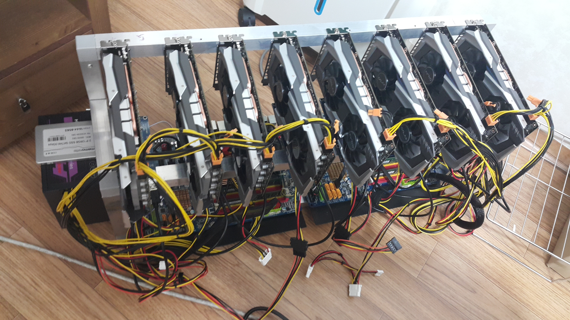 부품들을 수령한 후, 채굴기 조립에 들어갔다. 그래픽카드를 이용한 암호화폐 채굴기는 근본적으로 개인용 컴퓨터와 동일하다. 다만 채굴기는 채굴이라는 목적에 충실하게 채굴과 무관한 cpu, ram 등의 성능과 용량은 낮은 것을 탑재하고, 그래픽카드가 여러 개 설치된다. 운영체제 또한 PC와 같이 윈도우나 리눅스 등을 사용한다. 그래서 채굴기 조립은 PC 조립과 같은 방식으로 이루어지며, 그래서 PC를 취급하던 자영업자들이 채굴기를 함께 취급하거나 아예 채굴기만을 취급하기도 한다.