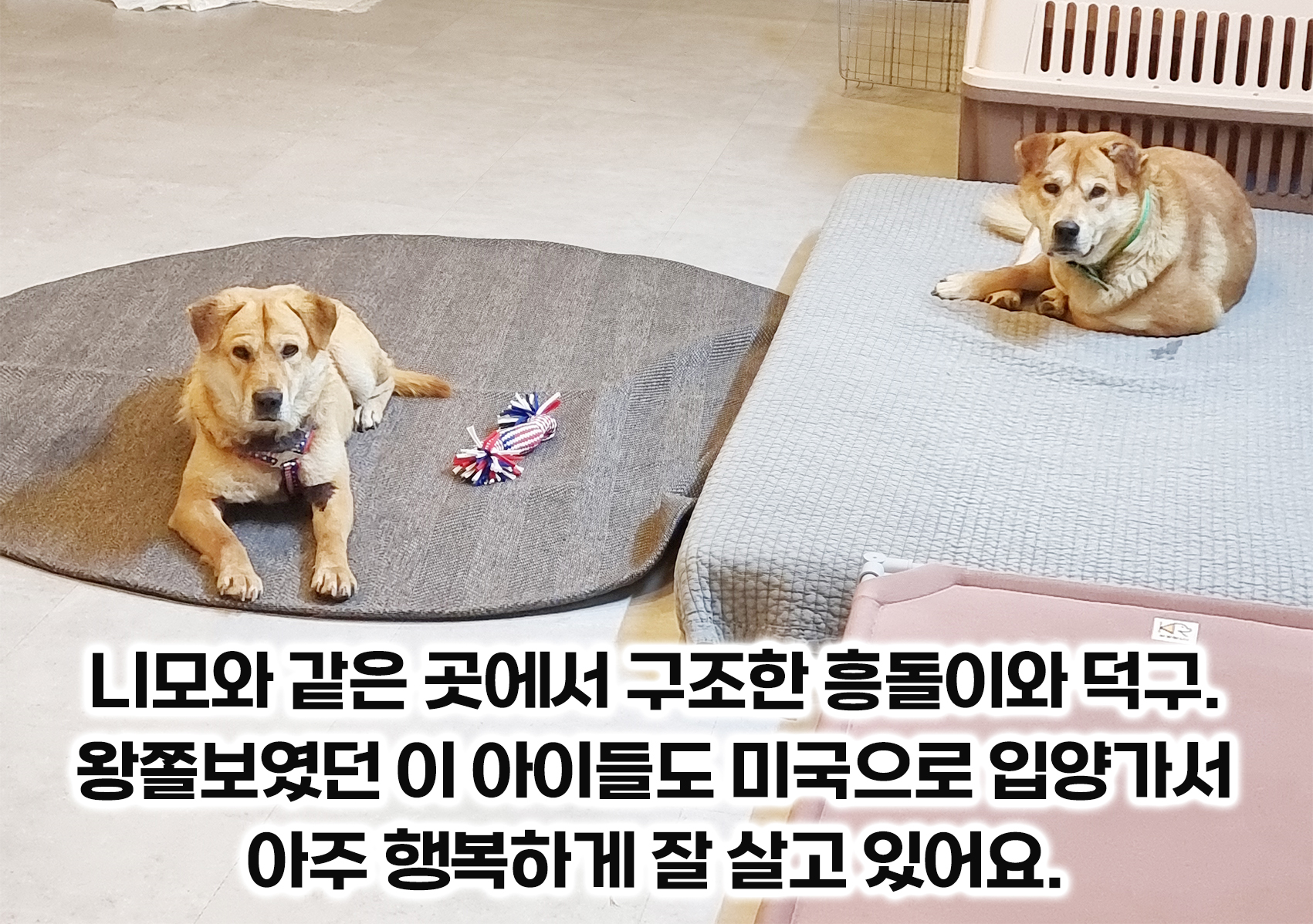 우리 니모는 운좋게 해외이동봉사자가 있었다. 샌프란시스코에 사는 교민으로 한국에 들어오실 때마다 이동봉사를 하시는 분이다. 니모와 다른 아이까지 대형견 2마리와 함께 나가신 그 분 덕분에 우리 니모는 끔찍한 기억을 뒤로하고 새출발을 할 수 있었다.