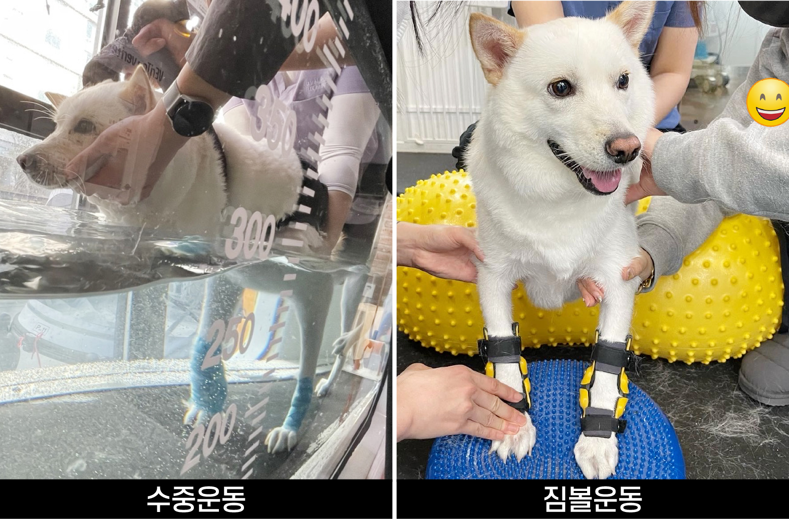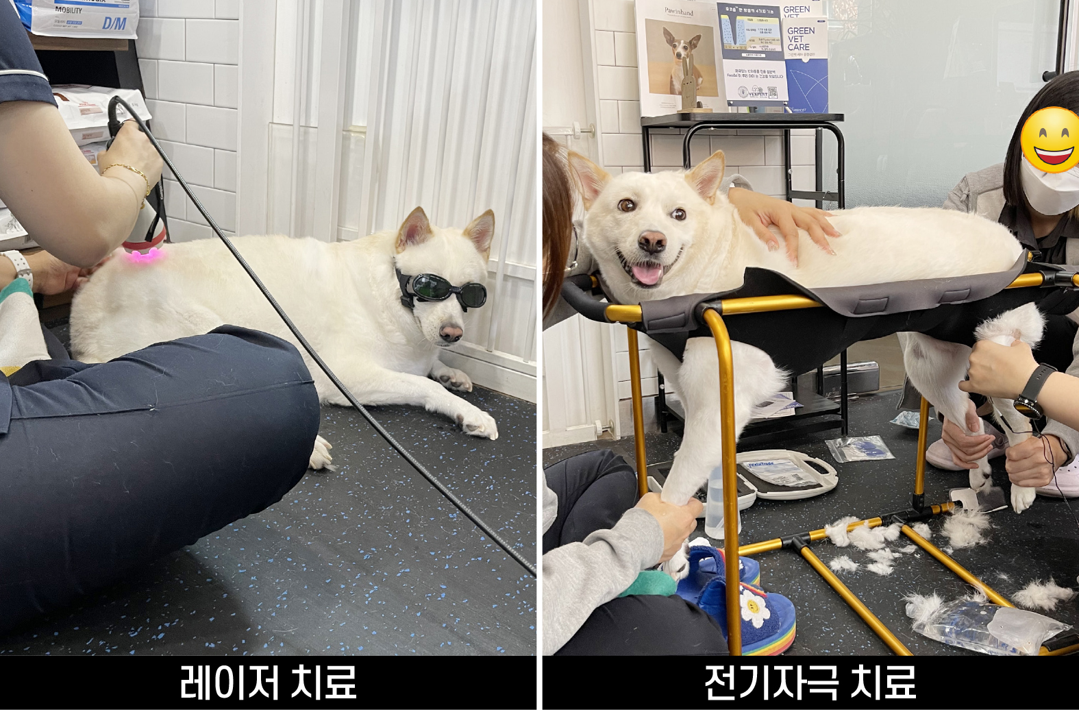 두 달 전부터 일주일에 한번씩 멀리 있는 동물병원에 가서 재활치료를 받고 있다. 병원에서 레이저, 한방침, 전기자극, 수중운동, 하니스운동, 휠체어운동, 짐볼운동 등을 번갈아가면서 한다. 관절의 부담을 줄이고 몸을 가볍게 하기 위해서 다이어트도 한다. 걷지 못하는 데다가 무서워서 똥오줌을 싸고 몸부림치는 하니를 데리고 병원을 오가는 것은 무척 힘든 일이다. 그리고 힘든 운동을 해본적이 없는 하니도 병원에 갔다오면 힘들어서 녹초가 된다.