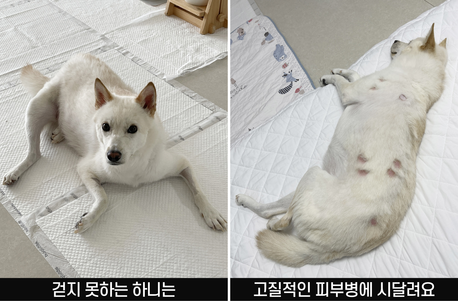 하니의 입장과 인간의 기준에 대해서 정말로 많은 생각을 했다. 생각할 때마다 마음이 이리저리 왔다갔다 했다. 과연 어떤 것이 하니를 행복하게 하는 일일까? 하니와 대화를 할 수 없으니 결정은 내가 해야 했다. 나는 아직 어린 하니가 평생을 이렇게 앞발로만 기어다니는 삶을 살게하고 싶지 않았다. 무엇보다 걸을 수 있는 아이를 엄마의 잘못된 판단으로 평생을 앉아서 지내게 하는 것 아닐까 두려웠다. 오랜 고민 끝에 많은 사람들이 말렸던 재활치료를 시작했다.
