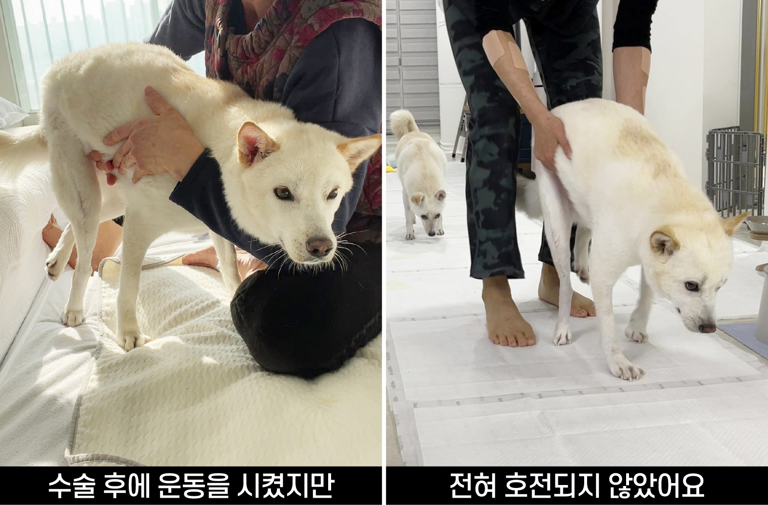 ‘하니’는 브·마·개 5회에서 소개했던대로 끔찍한 개농장에서 구조한 장애견이다. 뒷다리를 쓰지 못하는 하니, 걸을 수 있을 거라는 희망을 갖고 재작년 7월과 10월에 큰 수술을 했지만 수술 후 별다른 변화가 없었다. 그동안 집에서 운동을 시키기도 하고 전신 휠체어를 태우기도 했지만, 겁이 너무 많은 하니는 어떤 것에도 적응을 하지 못했고 이런 저런 노력은 모두 수포로 돌아갔다. 애초에 엄마 혼자서 장애가 있는 대형견을 운동시키는 것이 불가능에 가깝기도 했다. 수술한 병원과 아이들이 다니는 병원에서는, 재활병원에서 하는 수중운동·침치료 등의 특별한 재활치료는 권하지 않았다. 재활치료는 엄청난 비용과 시간이 필요하지만 효과는 미지수라는 것이 그 이유였다.