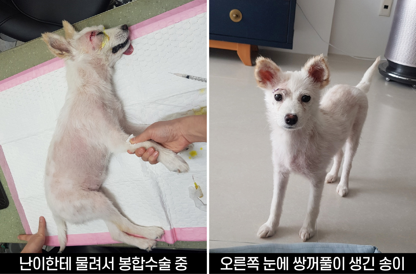 송이는 마취하고 눈 위를 꿰맸다. 심장사상충 치료 중에는 마취를 하면 안되지만 어쩔 수 없었다. 불행 중 다행인 것은 상처로 봤을 때 난이가 송이를 공격하려고 했다기보다는 짜증나서 왕! 한번 했는데 송이의 눈위 약한 피부에 이빨이 걸려서 찢어진 것 같다고 했다.