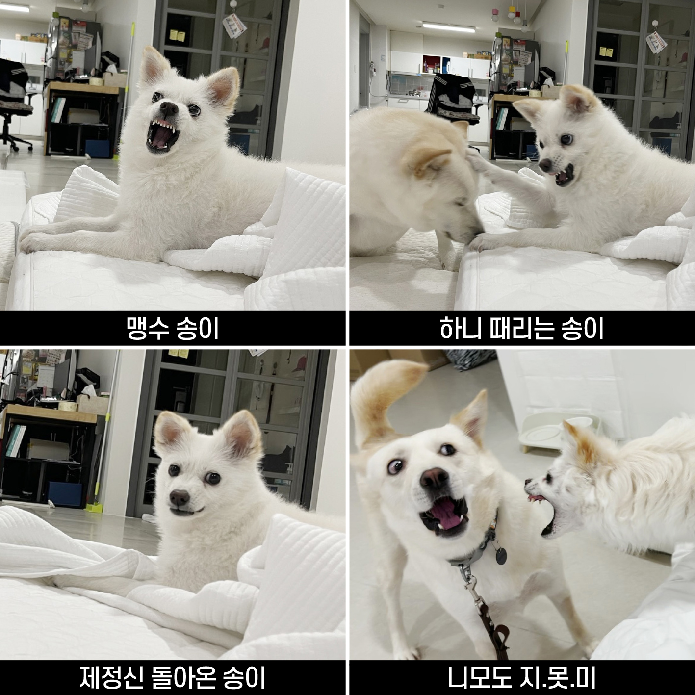 사고는 순식간에 일어나기 때문에 집안에 새로운 강아지를 들일 때는 보호자는 모든 순간을 조심해야 된다. 송이가 집에 올 당시 병휴직 중이었던 나는 외출을 거의 하지 않고 항상 아이들을 주시했다. 꼭 외출을 해야될 때는 난이와 송이를 안전문으로 분리해놓고 외출을 했다. 밥도 각자의 방에서 따로 먹였다.