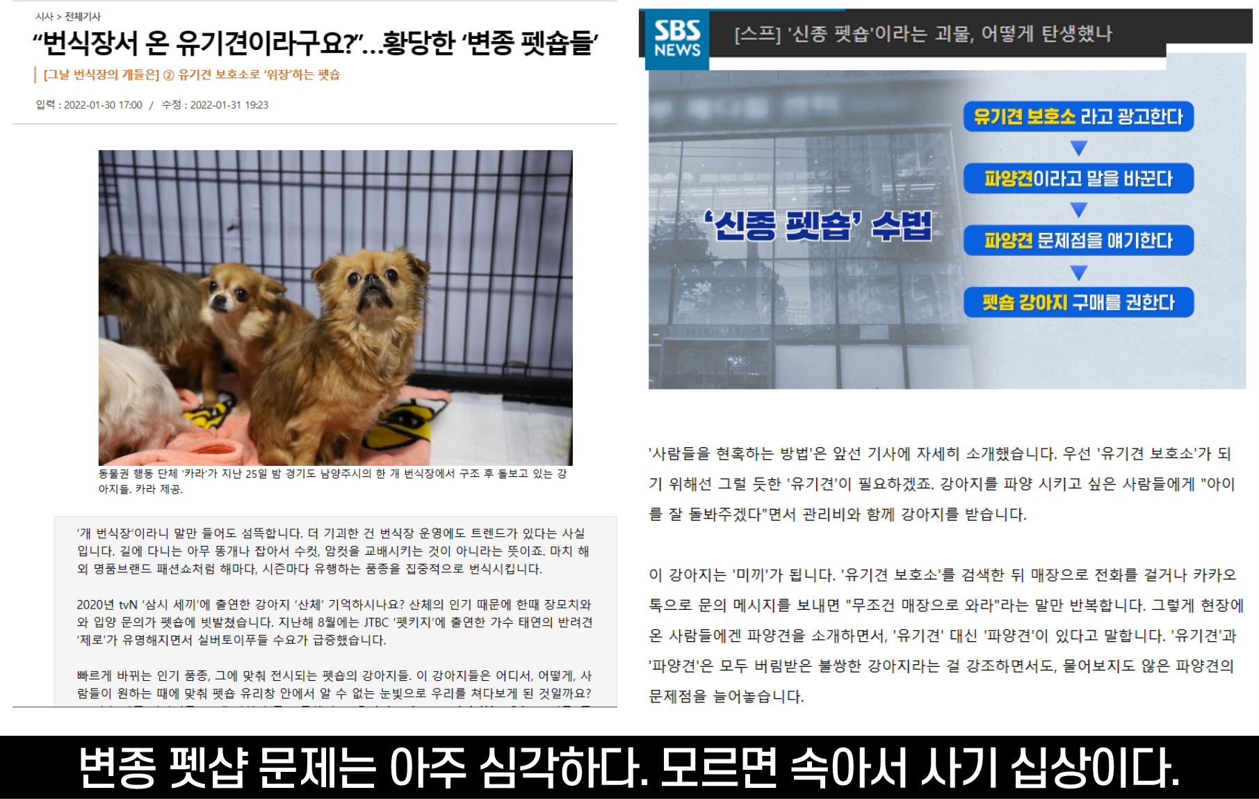 이런 인식의 변화를 재빠르게 간파해서 새롭게 돈벌이를 하고 있는 악덕 업자들이 있다. 바로 보호소를 가장한 변종(신종/사기) 펫숍이다. 포털이나 유튜브에서 광고하고 있는 ‘안락사 없는 보호소’는 100% 변종 펫숍이다.