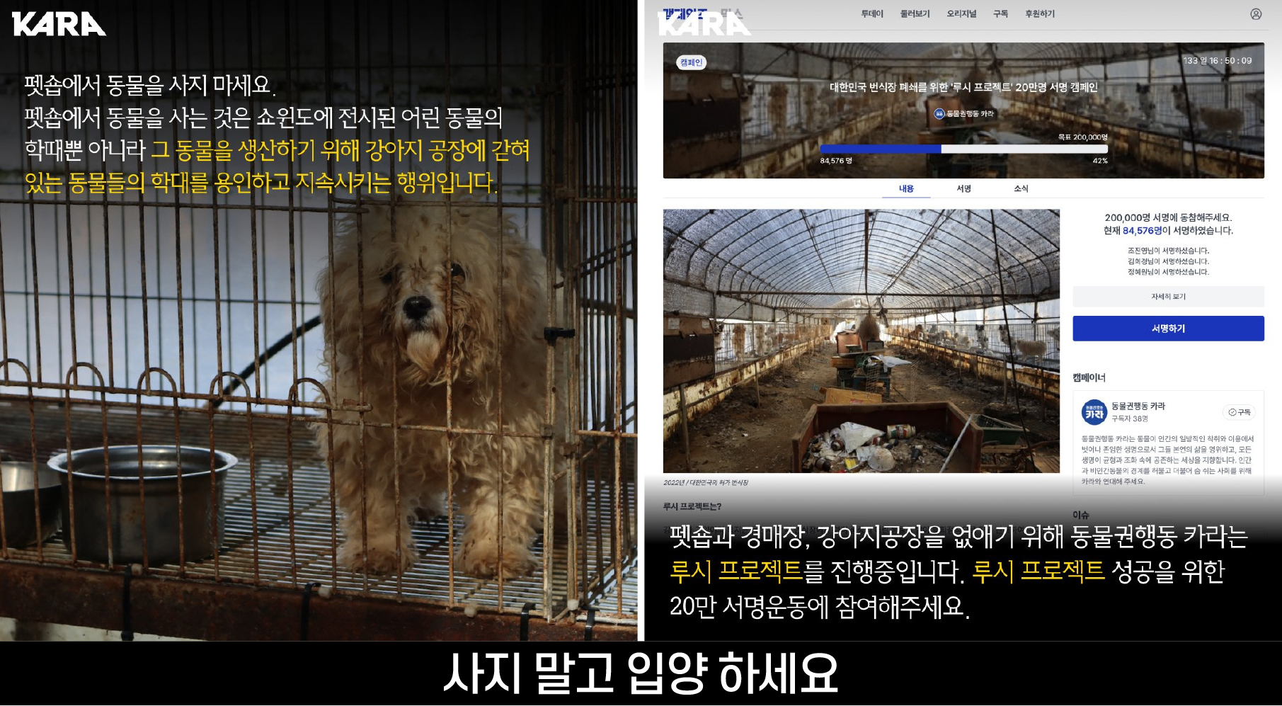 비록 빙산의 일각 수준이지만 끔찍한 번식장의 환경과 펫숍의 문제점이 조금씩 언론에 보도되면서 펫숍에 대한 인식은 예전같지 않다. 펫숍에서 강아지를 사오는 행위가 강아지 공장을 번창하게 하고 유기견을 양산한다는 사실을 인식하고 있는 사람들이 조금씩 늘어나고 있는 것이다.