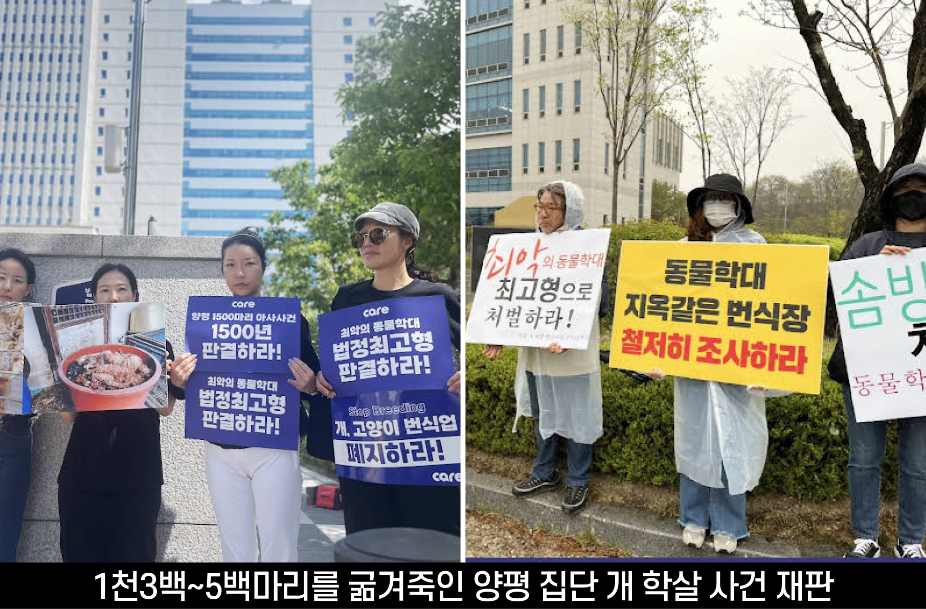 지난 3월에 양평에서 끔찍한 일이 일어났다. 양평 시골의 한 노인 집에서 개 사체와 유골 1천3백여구가 발견됐다. 이 노인은 2~3년 전부터 강아지들을 이곳에 버리는 조건으로 돈을 받고 ① 강아지 번식장에서 발정제를 맞고 평생 강제로 임신과 출산을 반복하다가 나이가 들거나 아파서 더 이상 새끼를 낳는 게 불가능해진 모견,부견들 ② 펫숍에서 예쁘지 않거나 개월 수가 많아서 팔리지 않은 강아지들 ③ 사람들이 반려동물로 키우다가 버리는 강아지들을 받아서 가두어놓고 먹이를 주지 않고 방치해서 굶겨 죽였다.
