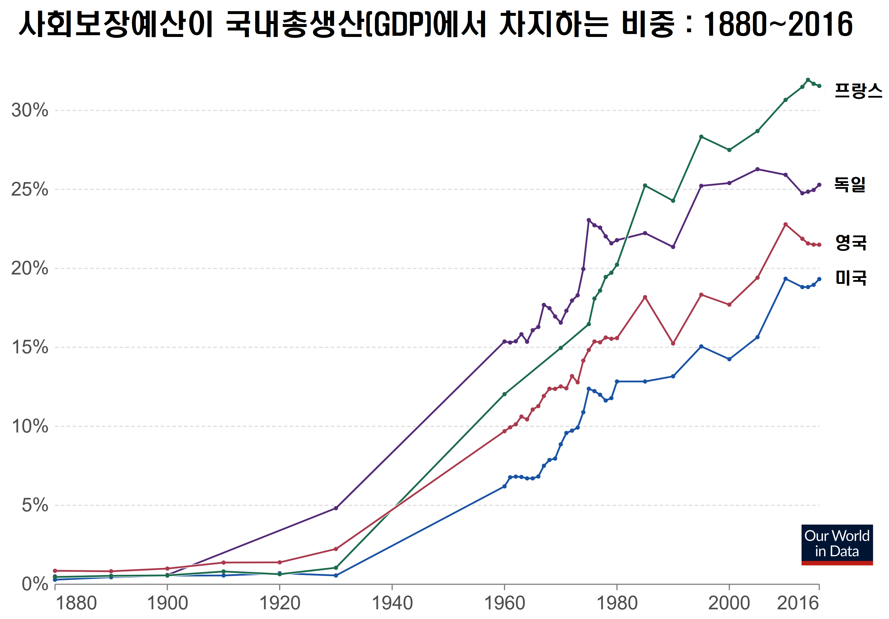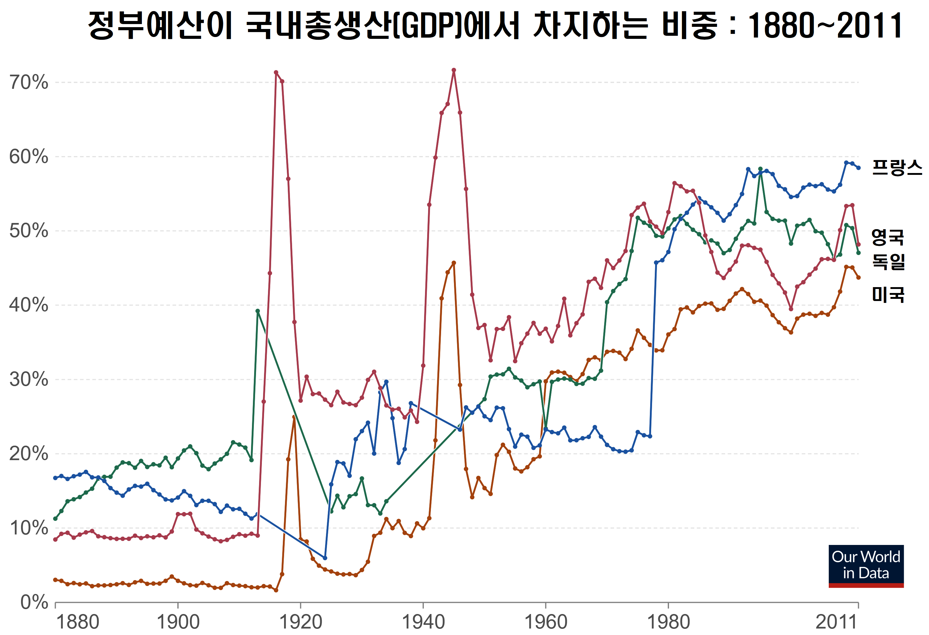 루즈벨트의 뉴딜 정책과 더불어 정부는 이른바 ‘경제 3주체’ 중 한 주체로 되었다. 오늘날 모든 경제학 교과서에 실리고 있는 이 ‘경제 3주체’ 이론은 그때까지 내려오던 자유주의 경제학 전통에서는 찾아볼 수 없는 내용이었다. 정부가 경제에서 차지하는 역할을 가늠해볼 수 있는 가장 선명한 지표들 중 하나로 국내총생산(GDP)에서 정부예산이 차지하는 비중을 꼽을 수 있을 것이다. 사민주의 황금시대를 거치면서 자본주의 진영에서는 정부가 국내총생산의 1/3 또는 절반 이상을 계획에 따라 분배하고 재분배하는 것이 경제질서의 구성요소로 확고하게 자리잡게 된다. 특히 사회보장 예산이 국내총생산에서 차지하는 비중이 정부들 사이의 성격 차이를 잘 보여주고 있다.
