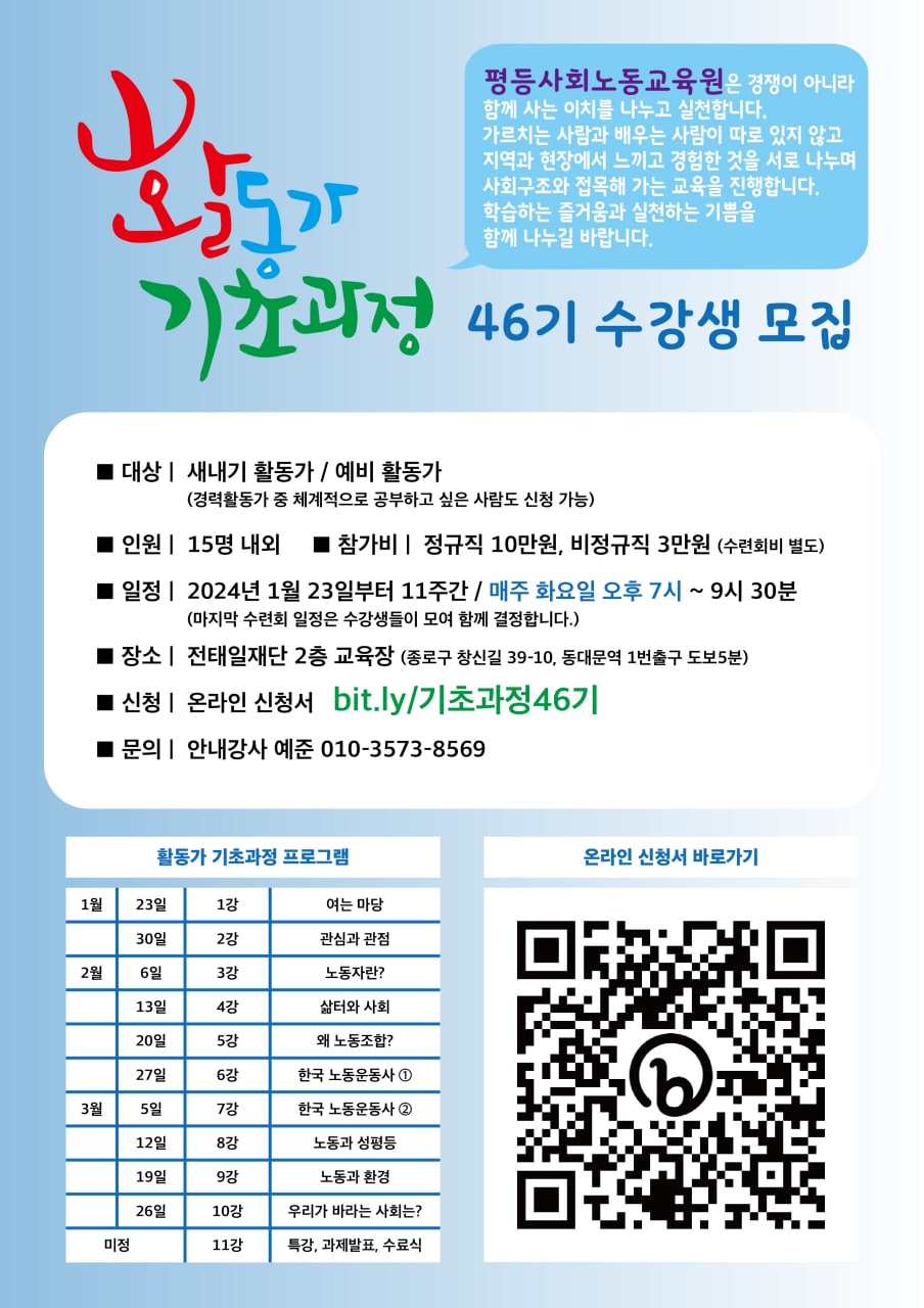 서울에서 <활동가 기초과정> 46기가 개강합니다. 일전에 45기가 인원 부족으로 연기되어 이번에 46기로 개강하게 되었습니다. 많은 관심 부탁드립니다!