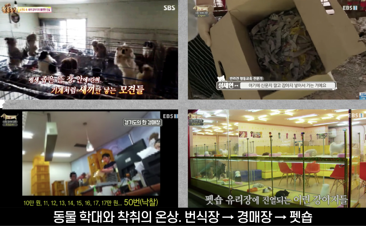 아무나 공장식 번식장을 운영할 수 있고, 생산업소와 판매업소가 분리되어서 경매장을 통한 공급과 펫숍을 통한 판매가 이루어지면서 동물 착취로 돈을 버는 초대형 생산‧판매업소가 더욱 많아지고 있으며 이런 생산-판매 루트를 통해 동물학대는 끊임없이, 더욱 잔인하게 이어지고 있다.