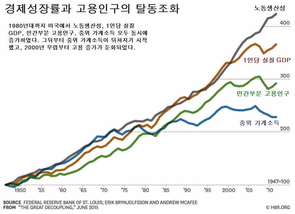 그러나 내가 볼 때, 경제성장과 고용인구의 탈동조화는 이제 부정하기 어려운 현실이 되었다. 문제는 그 의미를 이해하는 일이다.
