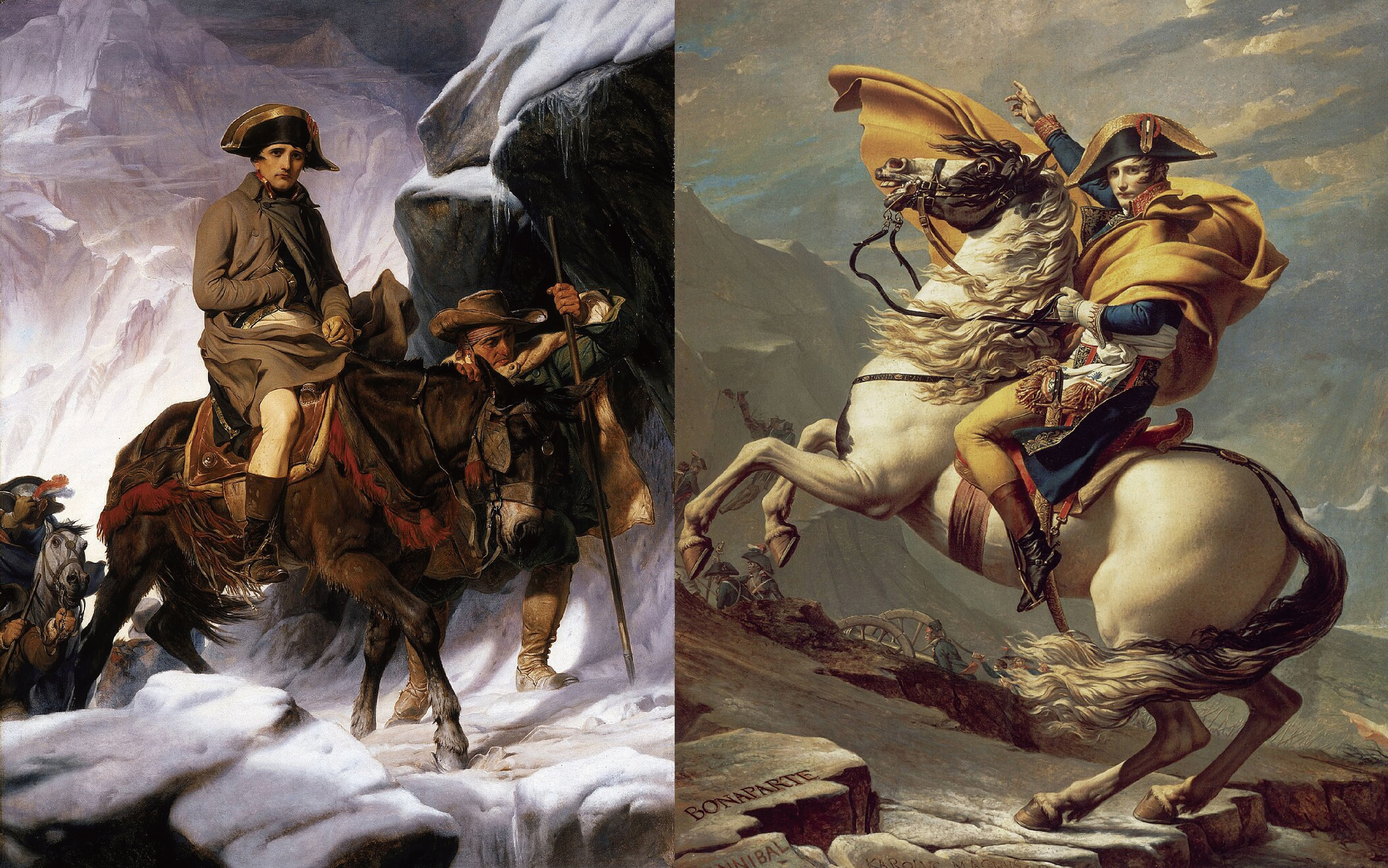 이 그림은 널리 찬양을 받았고, 복제품도 여럿 제작되었어요. 하지만 공화정이 몰락하고 쿠데타에 성공한 나폴레옹이 권력을 잡자, 다비드는 또다시 줄을 바꿉니다. 그리곤 우리가 나폴레옹을 떠올리면 떠오르는 대표적인 이미지를 만들어내요. 실제로는 농부가 이끄는 작은 노새를 타고 조심스래 알프스를 넘었지만, 멋지게 망토를 휘날리며 백마를 타고 지휘하는 영웅의 모습으로 그린 이 그림으로 나폴레옹의 인기는 더 높아졌다고 합니다.