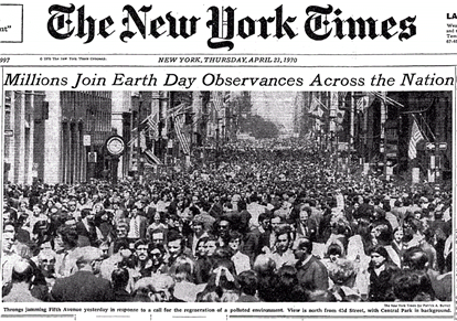 이렇게 해서 1970년 4월 22일에 개최된 ‘지구의 날’ 행사에는 미국 곳곳에서 무려 2천만 명이 넘는 사람들이 집회와 시위에 동참하여 세상을 깜짝 놀라게 했다. 단일 행사 참여 인원을 두고 본다면, 미국 역사상 최대규모에 속하는 행사였다. 뉴욕 5번가에서는 자동차의 통행을 금지시키고, 60만 명이 넘는 사람들이 센트럴파크에서 열리는 환경집회에 참여하기도 했다. 이렇게 탄생에 성공한 ‘지구의 날’은 매년 4월 22일에 거듭되면서 지구 전체로 퍼져나가게 된다.