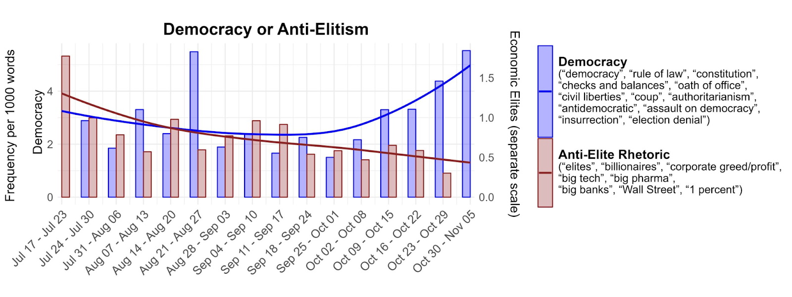 이번 대선 과정에서 선라이즈 무브먼트는 미국 녹색당의 질 스타인 후보에게 사퇴를 종용했다. 이 과정에서 유럽의 녹색당 연합 역시 주요 국가의 녹색당 연명을 통해서 트럼프의 패배를 위해서라도 질 스타인이 사퇴해야 한다는 압력을 넣었다. 곤란함과 스트레스는 미국 민주당과 해리스가 아니라 ‘역사상 가장 큰 좌절과 환멸을 느끼면서도 이들을 지지할 수 밖에 없는’ 기후운동에 전가 되었다. 이런 감정은 선거 이후 벌어지고 있는 다양한 논쟁에서 확인된다. 정체성 정치와 계급 정치 간의 갈등이라는 가짜논쟁에서 벗어나 점차 민주당-공화당의 양당체계에 대한 질문들이 진지하게 나오고 있는 중이다. 여기에 중요한 맥락 중 하나가 캠페인 과정에서 민주당의 해리스 후보들이 포퓰리즘의 계기를 스스로 포기했다는 평가다. 여기서 포퓰리즘은 앞서 소개한 AOC-트럼프를 지지한 유권자들이 말하는 real에 대한 관심 여부로 이해해볼 수 있다. 포퓰리즘은 기존 제도화된 정치에서 수용되지 않고 보이지 않는 것으로 여겨지는 중요한 문제들이 제도 바깥에서 등장하게 되는 계기들로 구성된다. <자코뱅>이 소개하는 대선 기간 동안 해리스 정치 캠페인에 대한 분석기사에서는 흥미로운 표 하나가 등장한다. 해리스 및 민주당이 공식적으로 내놓은 대선 캠페인과 발언 그리고 연설문을 통해서 분석한 결과, 9월 까지만 하더라도 재벌에 대한 문제나, 엘리트주의, 그리고 기업의 탐욕이나 빅 테크, 거대 은행, 월스트리트 문제가 주요하게 언급되었지만 그 이후 본 선거가 시작된 이후에는 법치나 헌법, 견제와 균형과 같은 전통적인 민주주의에 대한 가치가 더욱 많이 언급되었다는 것이다.
