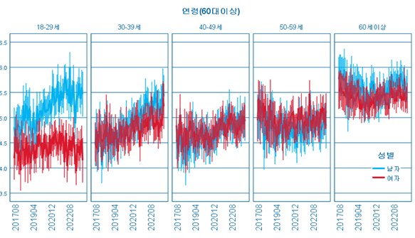오히려 전국지표조사와 더불어 한국행정연구원이 수행한 직접 대면 방식의 사회인식조사 등을 교차해서 보면 세대 간의 이념 격차보다는 오히려 세대 내 경제적 지위에 따른 이념 격차가 더욱 유의미하게 나타났다. 실제로 여론조사 기관이 수행하는 전국지표조사에서는 20대 이하에서 남성과 여성 간의 이념 격차가 눈에 띄지만 8,000명을 대상으로 대면조사 방식으로 진행한 사회인식조사에서는 동일한 세대 내에서의 이념적 차이는 크게 확인되지 않는다.