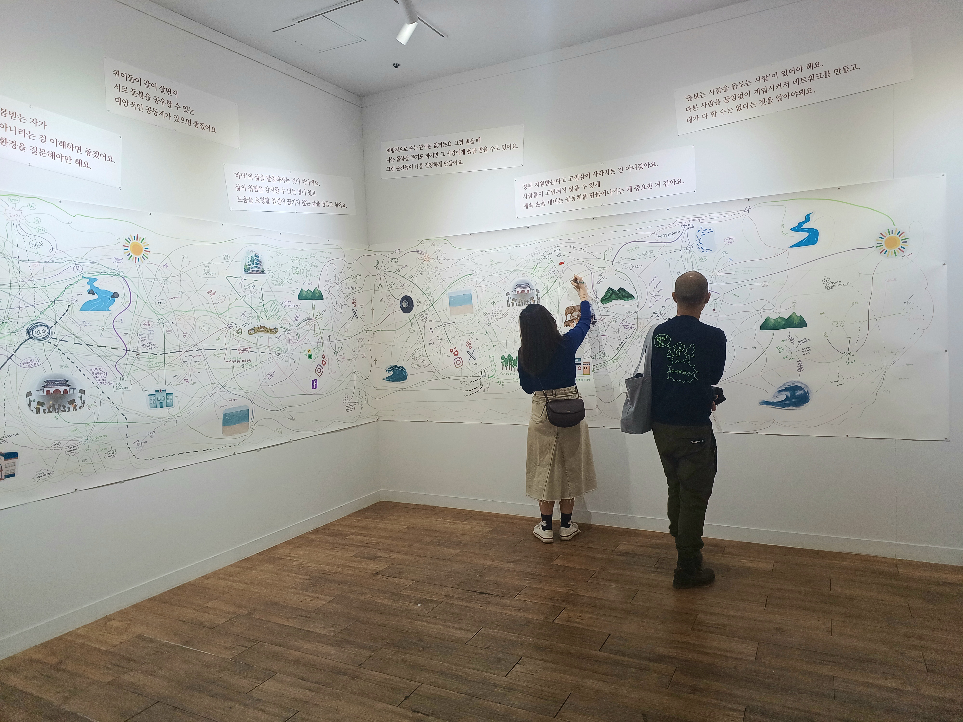 기존의 돌봄에 대한 통념을 전통적인 회화가 그대로 재현하였다면, 돌봄에 대한 인식을 확장하게 돕는 작업이 있습니다. 한국여성민우회의 주관으로, 발달장애청년허브 사부작, 언니네트워크, 청소년인권운동연대 지음, 트랜스젠더인권단체 조각보, 함께서봄의 활동가들과 함께 만든 전시 《우리의 취약함이 기어코, 》의 두 번째 섹션 ‘난잡한 돌봄’ 공간에 마련된 관객참여작업 <돌봄의 관계망 그리기>이 바로 그것이에요.