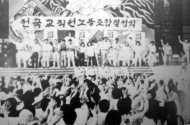 1989년 5월28일 전국의 교사들이 모여 연세대 학생회관 입구 계단에서 전국교직원노동조합(전교조)를 결성했다. 원천봉쇄라는 간고한 조건을 뚫고 한양대에서, 건국대에서, 연세대에서 결성대회를 치루었다. 전국에서 30여분의 선생님이 구속되고 100여분이 파면, 해임, 직위해제 당해 그 피해 이루 말할 수 없이 컸다. 그러나 전교조는 노태우 정권의 탄압에도 굴하지 않고 날이 갈수록 지부, 지회 창립이 늘어나고 학교별 분회도 500를 넘겼다. 비록 전남체육고 윤리교사였던 윤영규 위원장이 구속돼 서울구치소에 수감됐지만 교육 자주와 민주화를 위한 현장 교사들의 의지는 굳건했다.