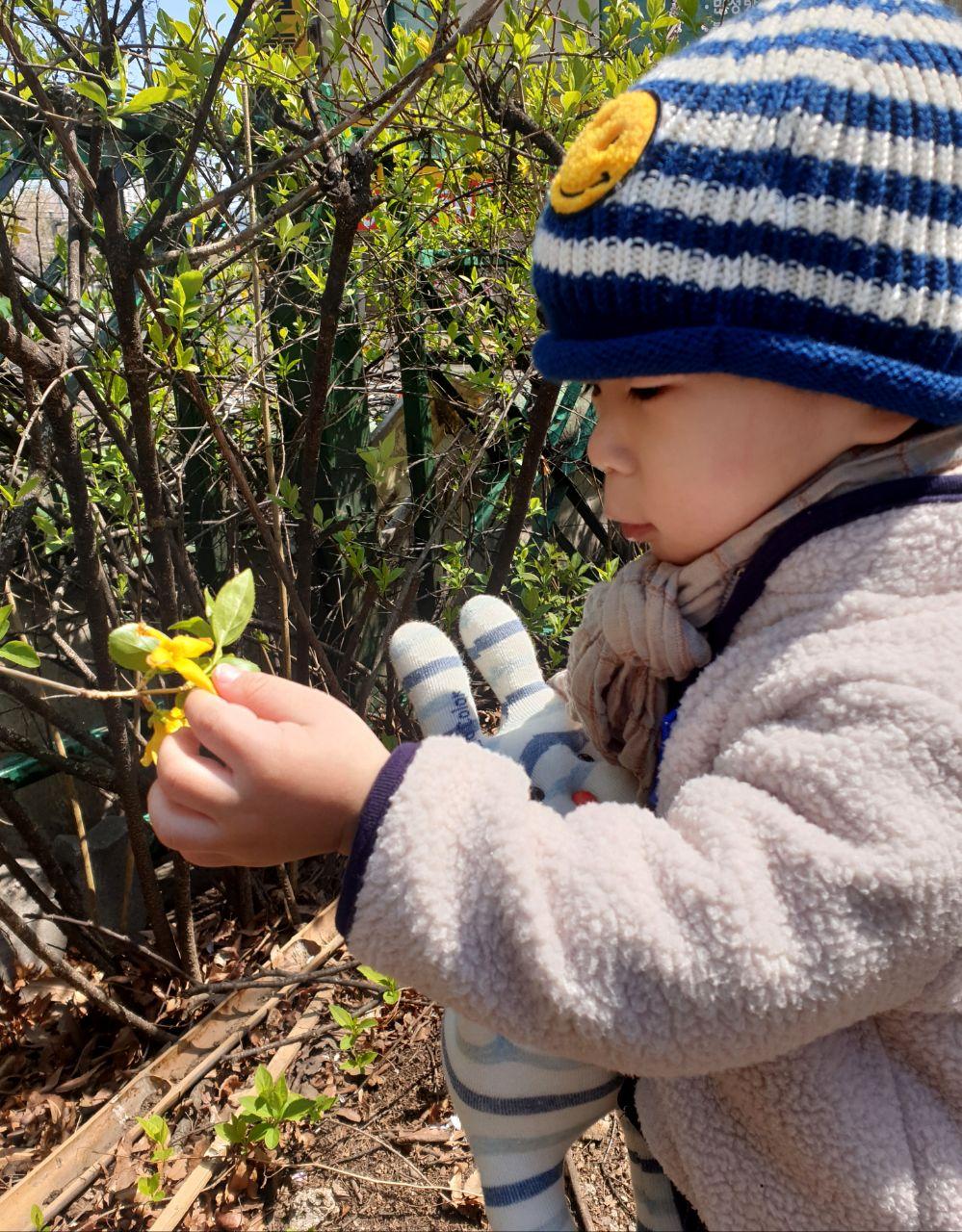 삑삑거리는 신발을 신고 현관문을 나서면서부터 수영이 얼굴에 웃음꽃이 핀다. 정말 환하게 웃는다. 엘리베이터까지 걸어가선 문 열라고 노크를 콩콩하고, 문이 열리면 조심조심 자연스럽게 탄다, 1층에 내리면 ‘오늘은 어디를 가나?’ 계획하듯 주차장을 한 번 눈으로 둘러본다. 여기서 위층 할머니라도 만나게 되면, (이제 아빠에게는 하지 않는) 온갖 귀여움을 뿜어낸다. 반갑다고 꾸뻑 인사하고, 다음에 또 뵙자고 ‘빠이 빠이’도 한다. 위층 할머니 입에서 ‘아이고! 이쁘다’,‘많이 껐네!’ 소리를 들으면 만족스러운 듯 혼자 물개 박수를 친다. 그리곤 짧은 다리로 난간을 붙잡고 뒤뚱뒤뚱 계단을 내려간다. 아스팔트 위에 서면 그때부터 본격적인 레이스가 시작된다! 조그만 몸으로 양순이를 안고 무조건 앞으로 전진이다. 전진하다가도 갑자기 방향 바꿔서 사방팔방으로 뛰어다닌다. 아빠는 그야말로 ‘시종’이 돼서 졸졸 뒤따른다. 그냥 따라가기만 하면 안 된다. 동영상도 찍고, 사진도 찍어야 한다. 어디서 차가 오는지도 봐야 하고, 바닥이 움푹 파여서 내려앉은 곳도 찾아야 한다. 아빠는 정신없지만, 수영이는 나들이를 즐긴다. 가다가 개나리꽃도 만져보고, 땅에 떨어진 벚꽃 잎을 뚫어지게 보고, 지나가는 (타요를 닮은) 버스를 보면 아빠도 보라고 손가락으로 가리킨다. 나가봤자 주차장이고, 고작 30~40분이지만 수영이에겐 더없이 신나는 시간임은 틀림없다. 솔직히 어른들도 돗자리도 가지고 나와서 도시락 까먹고 싶은 계절 아닌가!