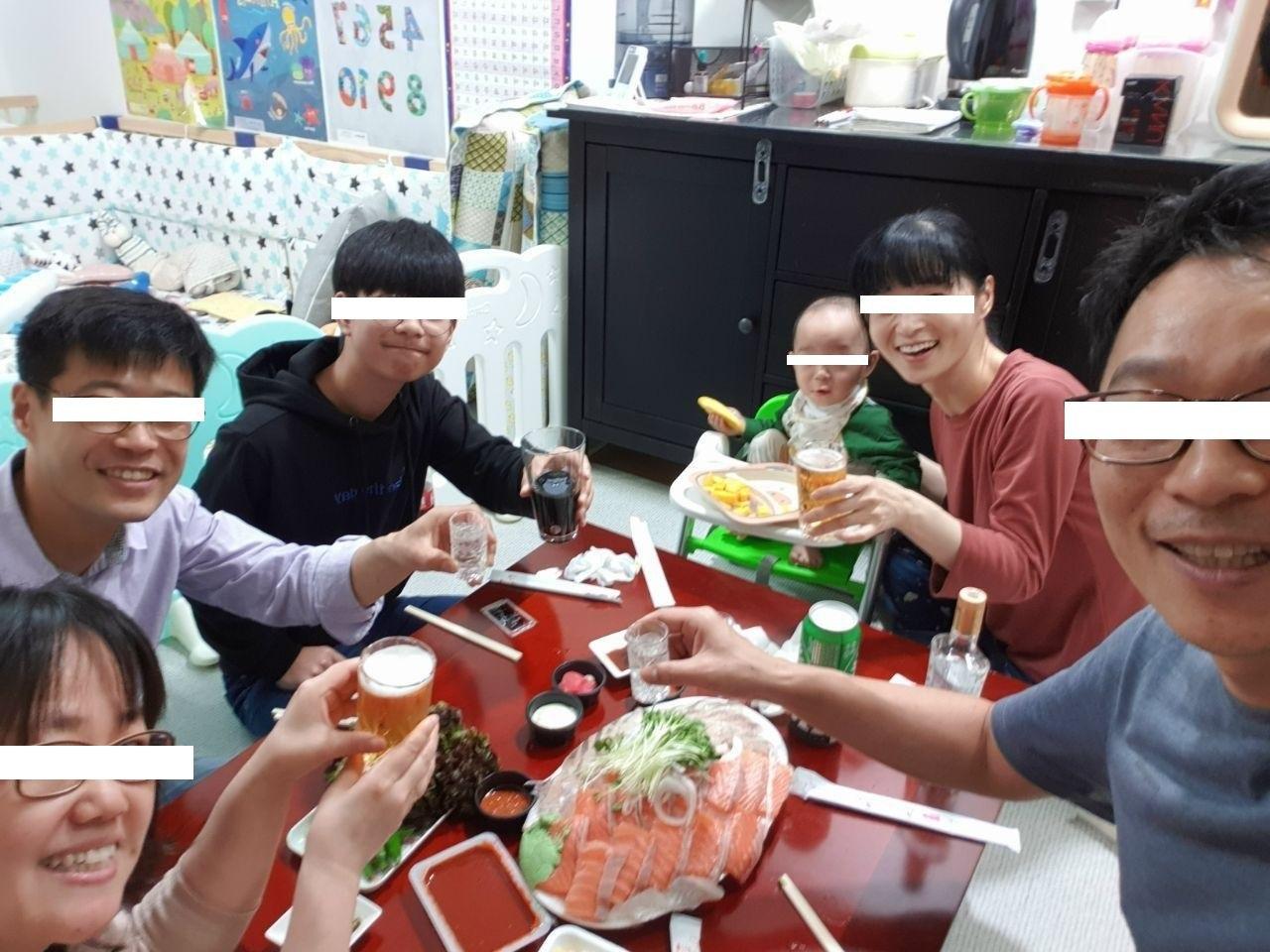 사실 처남은 연 이틀째 우리 집을 방문한 것이다. 애초 어머님과 아버님 모시고 할 가족모임이 하루 앞당겨지면서, 주문한 수영이 선물이 도착하지 않은 것이다. 결국 뒤늦게 도착한 선물을 처남이 직접 들고 온 것이다. 그렇게 애를 써서 준비하고, 가져온 선물이 기차 없는 기차놀이세트라니! 처남이 가장 황당했을 거다. 그러나 나와 지니는 기차까지 책임지라고 매몰차게 처남을 밀어붙였다. 물론 당사자는 억울함을 토로했다. 그리고 선물을 주기 위해 연 이틀째 방문하고 있음과 완구회사의 상술에 속았다는 것을 강조했다. 서로 입장차이로 불꽃 튀는 논쟁이 시작되려는 순간, 역시 연어회를 입안 가득히 흡입하던 조카가 한마디 했다. ‘외삼촌이 그러면 안 되지. 약속했으면 책임져야지!’. 믿었던 아들이 배신하자 결국 기차까지 책임진다라는 처남의 선언이 나왔다. 모든 것이 깔끔하게 정리됐다. 어른들은 소주잔을 들고! 조카는 초장 가득 연어회를 들고! 건배! 혼란과 논쟁 끝!