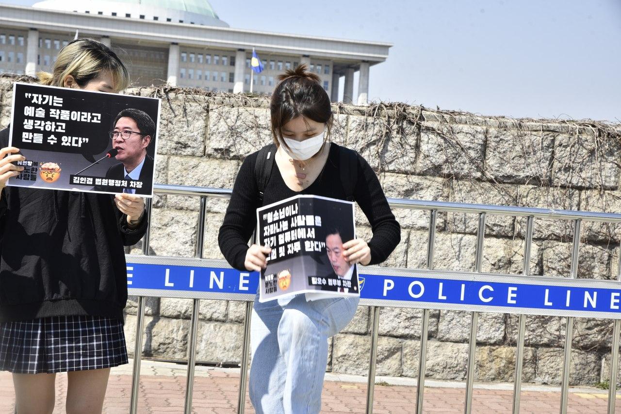 초반 활동은 입법에 집중되었다. 3월 23일 더불어민주당 원내대표실에서 오후 2시에 개최된 텔레그램 n번방 성폭력 처벌 강화 긴급 간담회 날, n번방에 분노한 사람들은 국회 앞에서 입법자들의 망언이 적힌 피켓을 들고 부수는 퍼포먼스를 진행했다. 간담회가 열리기 전 성적 합성 및 유포 처벌법 등 성폭력처벌법 개정안을 논의하는 자리에서 “자기만족 때문에 혼자 즐기는 것도 처벌할 것이냐”, “나혼자 그림을 그린다 생각하는 것까지 처벌할 수 없다”는 문제적인 발언이 있었고, 법무부 차관이라는 자가 “(청소년들이) 유명인들 갖다 놓고 혼자 자기 컴퓨터에서 그런 작업을 할 수가 있는데 그것을 처벌하겠다고 하는 것은 너무 과한 것 아니냐. 청소년이나 자라나는 사람들은 자기 컴퓨터에 그런 짓 자주한다.”라고 발언하며 남성 입법자들의 후진적 성인식을 여실히 드러낸 바 있었던 것이다.