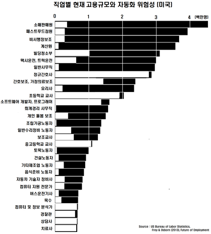 프레이는 우리를 두 번 놀라게 만들었다. 첫 번째는 2013년 간행된 <고용의 미래>라는 보고서의 충격이었다. 미국 노동시장을 대상으로 조사한 이 보고서에서 프레이는 현재의 직업들 중 47퍼센트가 10~20년 안에 자동화될 위험성이 크다고 예측하였다. 예컨대, 현재 고용규모가 가장 큰 직업은 소매판매원이며, 4백만 명이 훨씬 넘는 사람들이 종사하고 있다. 그런데 10~20년이 지나면 4십만 명도 남아있지 않을 것이라고 한다. 놀라운 주장이 아닐 수 없었다. 47퍼센트의 직업에 종사하고 있는 사람들이 조만간 인공지능에 의하여 일자리에서 밀려날 것이라니! <고용의 미래>는 인공지능 기술과 고용의 미래에 대한 전세계적인 논쟁에 불을 붙였다.