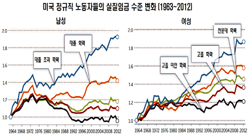 고용 규모만 양극화된 것이 아니라 임금 수준도 양극화되었다. 남성 고숙련 노동자층의 실질임금은 빠르게 상승한 반면에 남성 중간숙련 및 저숙련 노동자층의 실질임금은 정체하거나 오히려 하락하였다. 그에 비하여 여성 중간숙련 및 저숙련 노동자층의 실질임금은 더디지만 꾸준히 상승되었다.